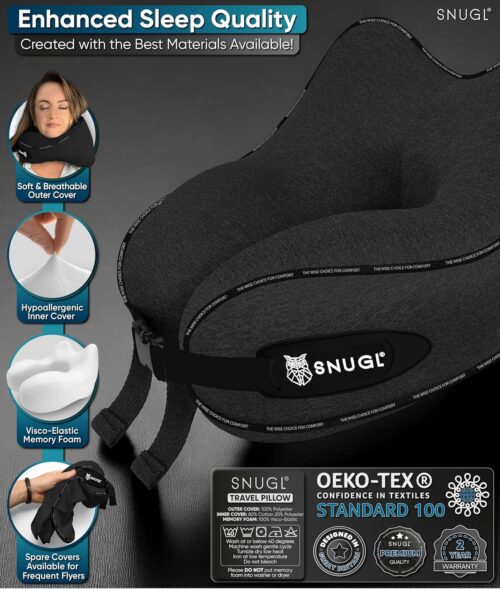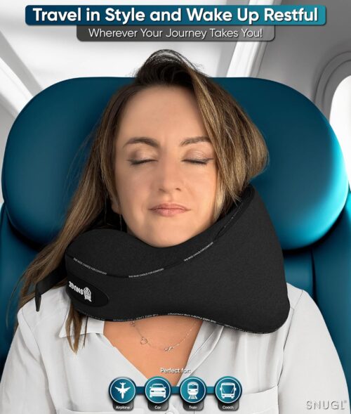 SNUGL Travel Pillow – Memory Foam Neck Cushion – Flight Pillow | Support Neck Pillow for Travel | Travel Neck Pillow for Airplane with Carry Bag & Clip | Flying Essentials (Black – Regular)